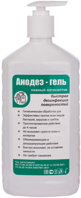Антисептическое средство Анодез-гель представляет собой бесцветный прозрачный гель со спиртовым запахом. Может применяться как кожный антисептик, так и экстренное дезинфицирующее средство для обработки поверхностей. Разрушает на поверхности биологические пленки, обладает очищающими и дезодорирующими свойствами, облегчает и ускоряет удаление жировых и пигментирующих загрязнений (в том числе застарелых) на обрабатываемых поверхностях. Имеет пролонгированное антимикробное действие в течение 4 часов. Не требует смывания после обработки.