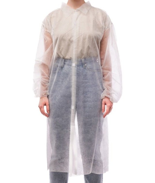 Одноразовый халат производится из гипоаллергенного, мягкого и легкого, но прочного материала – спанбонда. Водонепроницаем, не пропускает пыль и вредные микроорганизмы. Не требует стирки и сушки, подходит только для одноразового использования.